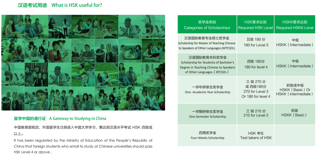 1.硕士学位奖学金:HSK五级≥180分,HSKK成绩(口试)成绩≥中级60分。