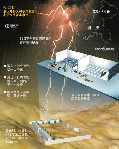 昨日下午,一场大范围的雷暴天气袭击了重庆开县。下午4点30分左右,位于开县义和镇山坡上的兴业村小学突然遭遇雷击,正在教室里上课的两个班级有46名学生被雷电击伤,酿成其中7人当场身亡、39人不同程度受伤的惨剧。