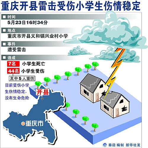 从重庆市开县官方得到证实,二十三日下午四时许,开县一小学遭遇雷击事故,导致该校学生七死三十九伤,其中十九人为重伤。