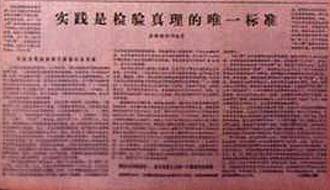 [实践是检验真理的唯一标准]它是针对“两个凡是”提出来的。随着这一观念的确立,中国人民得到两种最为宝贵的财富:一是务实作风,恢复实事求是的优良传统;二是解放思想,敢于打破各种不利于改革的禁锢。
