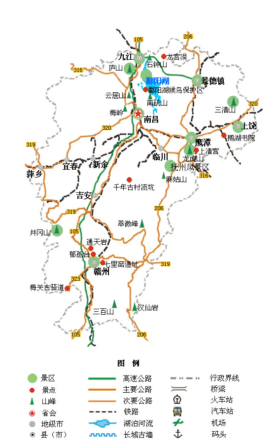 景观:沿“大京九”畅游江西,观庐山云雾,赏井冈翠竹,望鄱阳湖湖光山色,到景德瓷都怀古,去道教名山——龙虎山和三清山揽胜,豫章美景,尽收眼底。