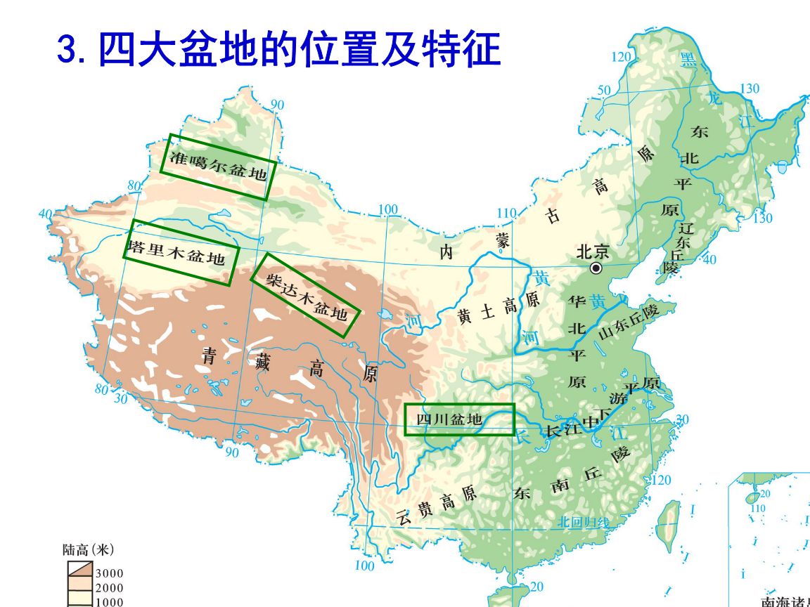 2.记住中国四大高原、四大盆地、三大平原的名称。