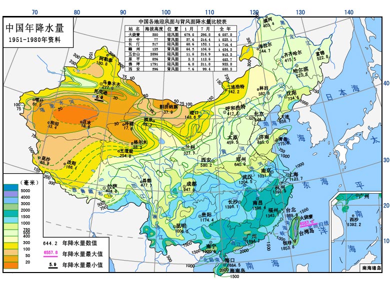 1.年降水量的空间分布 从中国年降水量分布图可看出:800毫米等降水量线在淮河—秦岭—青藏高原东南边缘一线;400毫米等降水量线在大兴安岭—张家口—兰州—拉萨—喜马拉雅山东南端一线。塔里木盆地年降水量少于50毫米,其南部边缘的一些地区降水量不足20毫米;吐鲁番盆地的托克逊平均年降水量仅5.9毫米,是中国的“旱极”。中国东南部有些地区降水量在1600毫米以上,台湾东部山地可达3000毫米以上,其东北部的火烧寮年平均降水量达6000毫米以上,最多的年份为8408毫米,是中国的“雨极”;