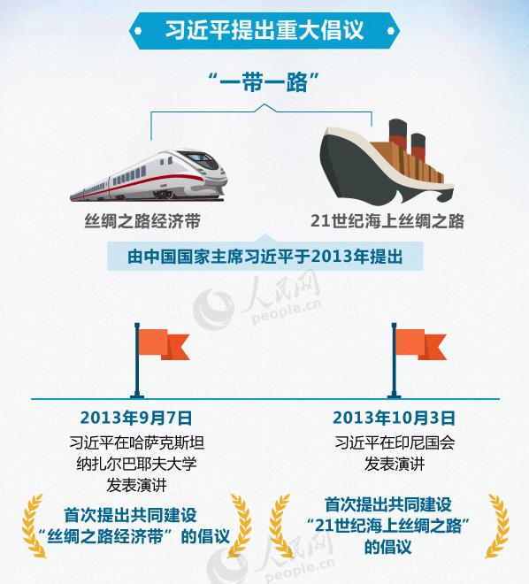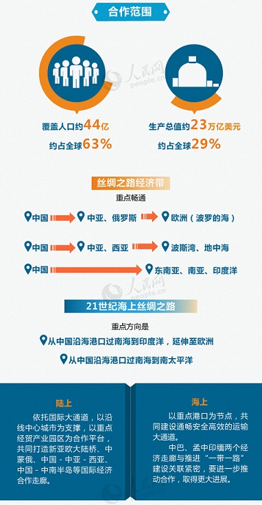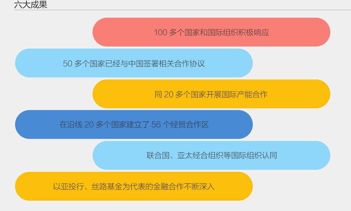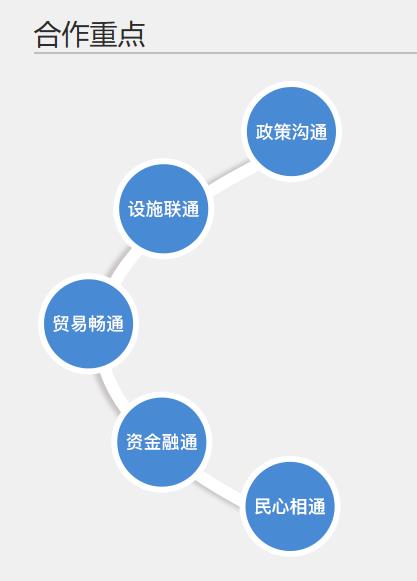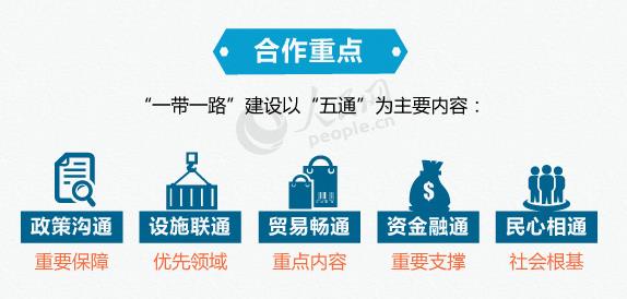 一带一路沿线共有65个国家和地区  你好,一带一路!(626)  通过76秒快剪短视频介绍“一带一路”这一国家级顶层战略。从提出、主要内容、建设原则、四大理念、重点企业工程项目延伸到各个行业介绍一带一路的大概内容。  Let's go Belt and Road 一带一路 世界合奏 “一带一路”一起唱341   >> 2013年10月2日,习近平主席提出筹建倡议,2014年10月24日,包括中国、印度、新加坡等在内21个首批意向创始成员国的财长和授权代表在北京签约,共同决定成立投行。2015年12月25日,亚洲基础设施投资银行正式成立。2016年1月16日至18日,亚投行开业仪式暨理事会和董事会成立大会在北京举行。>>> 二、“一带一路”倡议提出的时代背景及推进的重要节点 三、“一带一路”的共建原则和框架思路 四、“一带一路”建设的合作重点及成果  合作重点——“五通”    “五通”—— 政策沟通 设施联通 贸易畅通 资金融通 民心相通 一带一路——互通之路 中国人说:要想富,先修路 巴基斯坦商人:好通道带来好生意  2017年4月22日来自巴基斯坦的商人卡里姆(左)为顾客介绍宝石。 24年前,巴基斯坦商人卡里姆的父亲从巴基斯坦来到中巴边境的新疆维吾尔自治区塔什库尔干塔吉克自治县,将来自中亚的宝石、手工艺品和特产通过连接中巴两国的喀喇昆仑公路运到新疆,再卖到全国各地。十年前,卡里姆从他父亲手里接过生意,而且越做越大。 “中巴经济走廊建设极大改善了交通和物流,我的生意也越来越好。”卡里姆对记者说,从塔什库尔干塔吉克自治县到他在巴基斯坦的家里只需要5个小时,比以前快多了。新华社记者江文耀摄  这是2017年4月24日在巴基斯坦北部用无人机拍摄的喀喇昆仑公路二期(赫韦利扬至塔科特段)阿伯塔巴德隧道施工现场。新华社记者刘天摄 超级国际公路   2015年12月2日,连接老挝首都万象与云南昆明的中老铁路老挝段(磨丁至万象)举行开工奠基仪式。这段铁路预计将于2020年建成。这段铁路从两国边境磨憨/磨丁口岸进入老境内后,向南依次经过孟赛、琅勃拉邦、万荣至首都万象邻近泰国的跨湄公河新桥,全长427.1公里,其中60%以上为桥梁和隧道,建设标准为国铁Ⅰ级、单线设计、电力牵引、客货混运,最高时速160公里。未来从万象搭乘火车至磨憨可能仍需5个小时以上,而至昆明则可能需要10个小时以上,但这已经是巨大的跨越。 中老铁路建设242    2015年8月13日,中国铁路总公司在印度尼西亚首都雅加达举办“中国高速铁路展”,向印尼各界宣介中国高铁发展史及技术优势。  >>>  2015年10月16日,中国驻印度尼西亚大使      2015年10月16日,在印尼首都雅加达,中印尼企业代表在签约仪式现场举行新闻发布会。 中国海外承建首条高铁通车 时速250公里 2014年07月26日  土耳其安卡拉至伊斯坦布尔