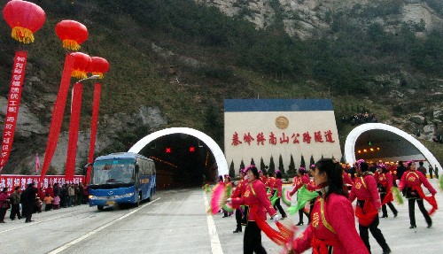 2007年1月20日,全长18.02公里的秦岭终南山公路隧道正式通车,这是中国自行设计施工的世界最长的双洞单向公路隧道,人们驱车15分钟就可以穿越秦岭这一天然屏障。中国工程技术人员历时4年零9个多月创造的一项世界之最使中国南北分界线秦岭天堑变通途。 新华社记者 陶明 摄